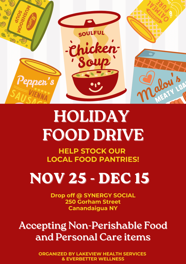 Join us this holiday season in stocking our local food pantries! Our first annual Holiday Food Drive is up and running from now until Mid-December. We invite community members to donate non-perishable food and personal care items at the drop box located by the back door at Synergy Social on Gorham Street in Canandaigua NY. Together, we can provide essential nourishment and necessary supplies to families in need during this festive time. Every little bit counts! Your generosity can make a significant impact on the lives of our neighbors. Let’s come together as a community to spread joy and warmth in this season of giving.